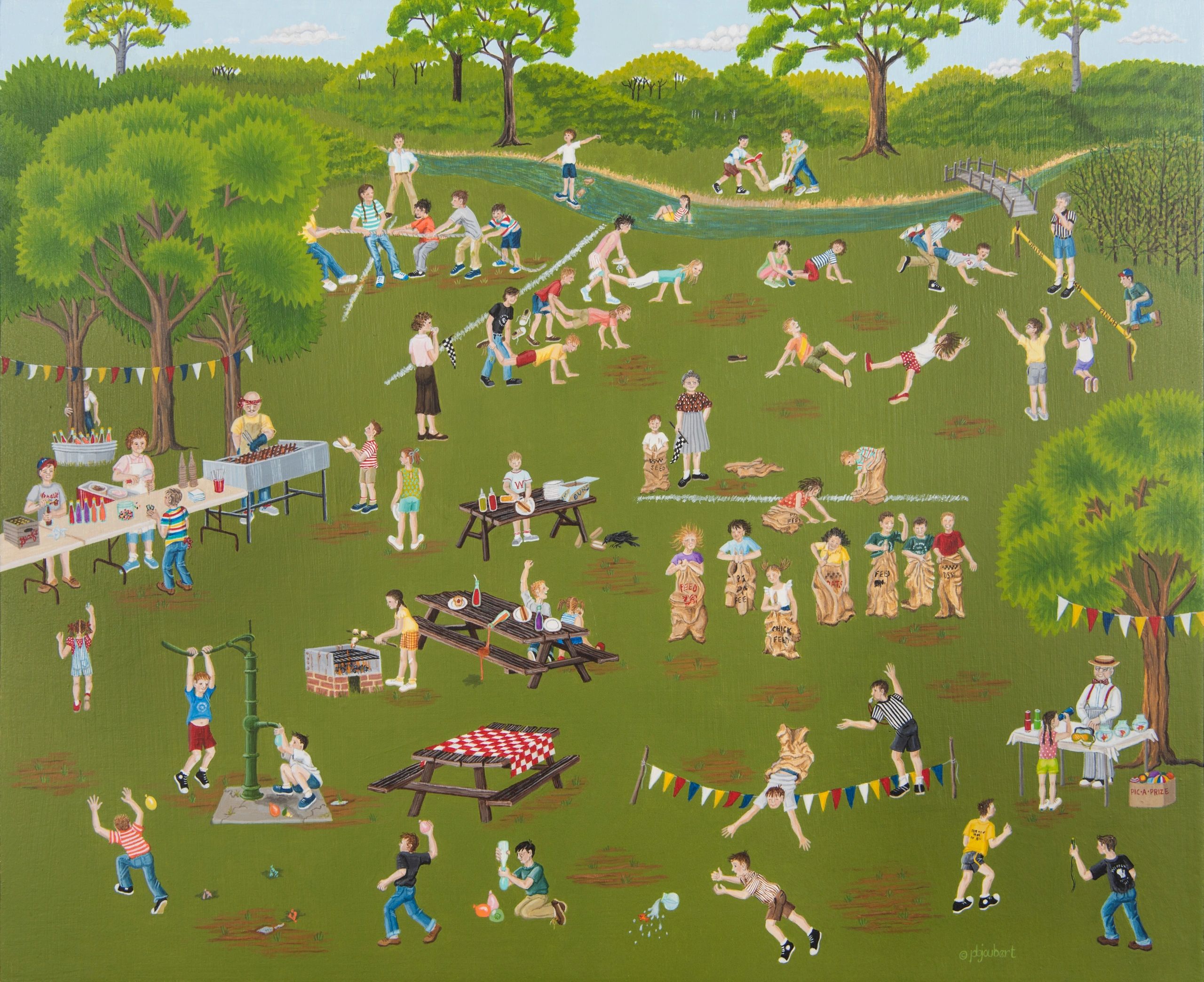 I might have called this merry scene “Sports Day” or even “The Sunday School Picnic,” but for me it recalls the school picnics of my childhood. It captures that much-anticipated late spring day when our elementary school teachers reinvented themselves as the directors of our play activities—coaches, judges, and umpires. No bounce houses or ball pits here. Instead, an adult committee, composed of parents and teachers, worked for weeks rounding up burlap sacks, sturdy ropes, and all manner of balls and balloons, plus inexpensive prizes, to keep us occupied for the day. While I don’t think water balloon fights or tossing the girls into the creek were on the official agenda, these activities were no doubt anticipated and cheerfully ignored by the adults in charge. We kids arrived dressed for play and armed with a fistful of “tickets” that had been distributed in our classrooms before loading the bus that morning. The complimentary tickets were to be used to “buy” unlimited quantities of hot dogs, ice cream treats, and soda. It all made for a day of fun and probably more than a few bellyaches!