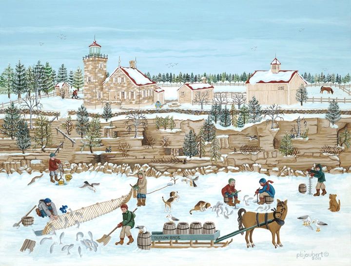 William Duclon was keeper at Eagle Bluff Lighthouse from 1883 to 1918. "Captain" Duclon and his wife Julia were the parents of seven, all sons. Naturally, the boys helped both parents in maintaining the lighthouse and in various housekeeping duties, since there were no daughters to carry water, tend to the gardens and animals, and help Julia with the demands of the large household. Living so close to the water, the boys turned to fishing both in summer and winter, initially to supplement the family's food supply and, later when they grew up, to provide fish for the population of Door County and beyond. By the 1890s, Duclon Brothers was one of the leading commercial fisheries in the area. During the winters, the boys probably dropped lines through the ice and fished with gill nets to catch the herring and lake trout, which teemed in the fresh waters of the bay. Once navigation closed for the winter in Green Bay and the light was extinguished for the season, Captain Duclon would join his sons in their fishing business.